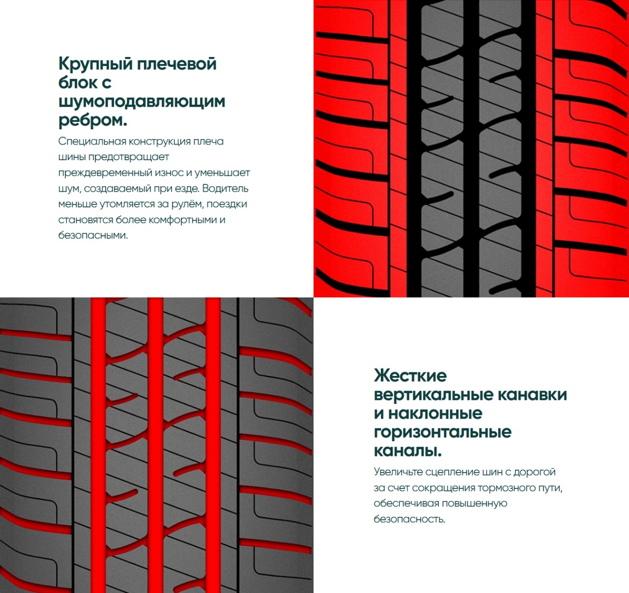 Шина обеспечивает уверенное поведение автомобиля как на сухом, так и на мокром покрытии, помогая водителю сохранять стабильность управления и безопасность в различных дорожных условиях.