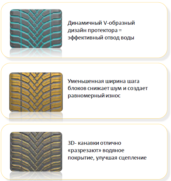 - V-образный направленный рисунок с развитой системой дренажных каналов активно отводит воду из пятна контакта. Это снижает риск аквапланирования и помогает сохранять предсказуемость управления в дождливую погоду.