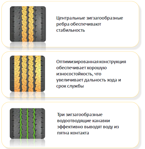 - Стойкость к аквапланированию — сразу 3 латеральные канавки, соединённые сетью поперечных насечек, выполняют дренажную функцию и поддерживают сцепление с мокрым асфальтом, эффективно предотвращая водяной клин.