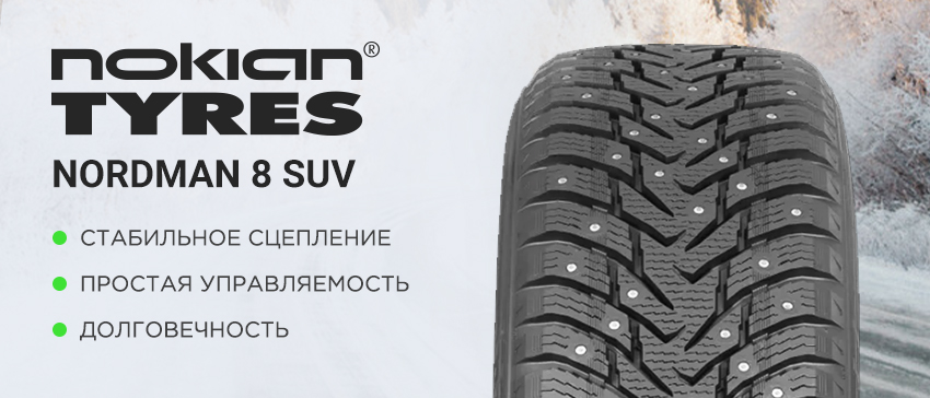 Шипованные шины Nokian Nordman 8 SUV станут отличным выбором для зимней экипировки кроссоверов и внедорожников, так как в любых климатических условиях северных зим они обещают контролируемое поведение и надёжное сцепление с обледенелыми и заснеженными дорогами.