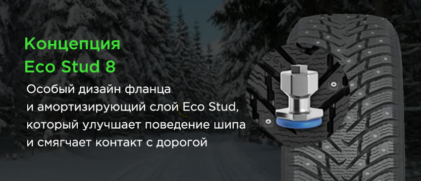 За надёжность сцепных свойств Nordman 8 SUV в переменчивых зимних условиях отвечает концепция ошиповки Eco Stud 8, адаптированная к шинам для тяжёлых и габаритных транспортных средств.