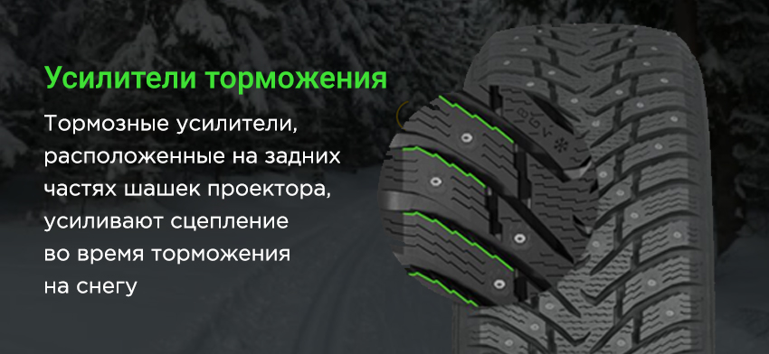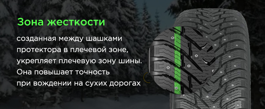 Шипы по всему протектору шины распределяются равномерно, благодаря чему они не перекрывают друг друга и каждый из них всегда попадает на свежий лёд, что гарантирует наилучшее сцепление при любых обстоятельствах.