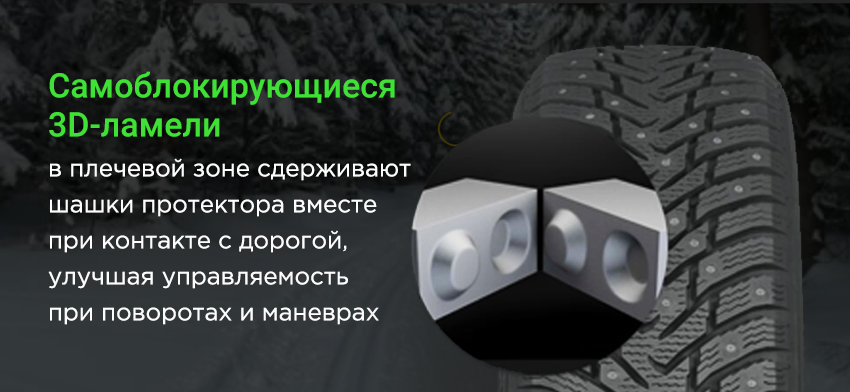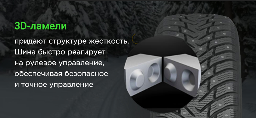 Все блоки направленного симметричного протектора модели покрыты трёхмерными ламелями.