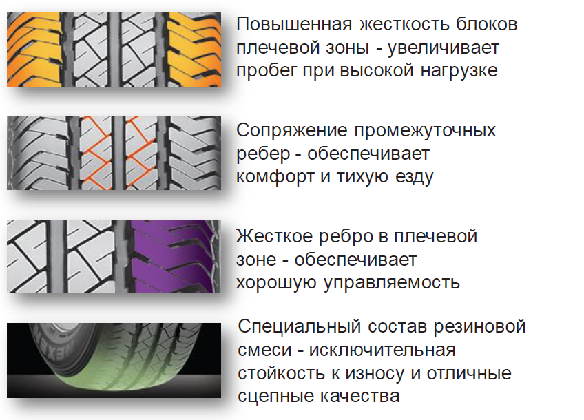 - Специальная форма блоков протектора снижает уровень шума во время движения, делая поездки более комфортными даже на длинных маршрутах.