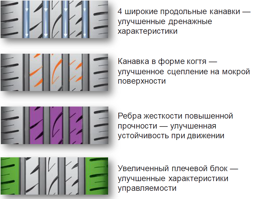 - Четыре широкие продольные канавки быстро отводят воду из пятна контакта. Это снижает вероятность аквапланирования и помогает сохранить контроль над автомобилем во время дождя.